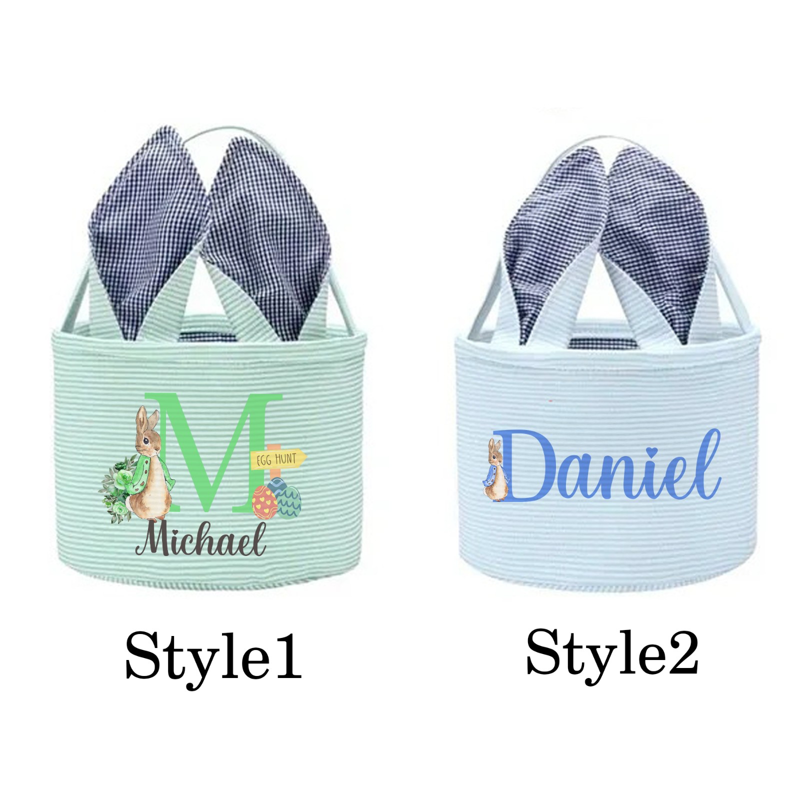 Custom Name Peter Rabbit Alphabet Easter Basket with Bunny Ears, Easter Egg Hunt Basket, Seersucker Easter Goodie Bag, Easter Gift for Kids/Boys/Girls