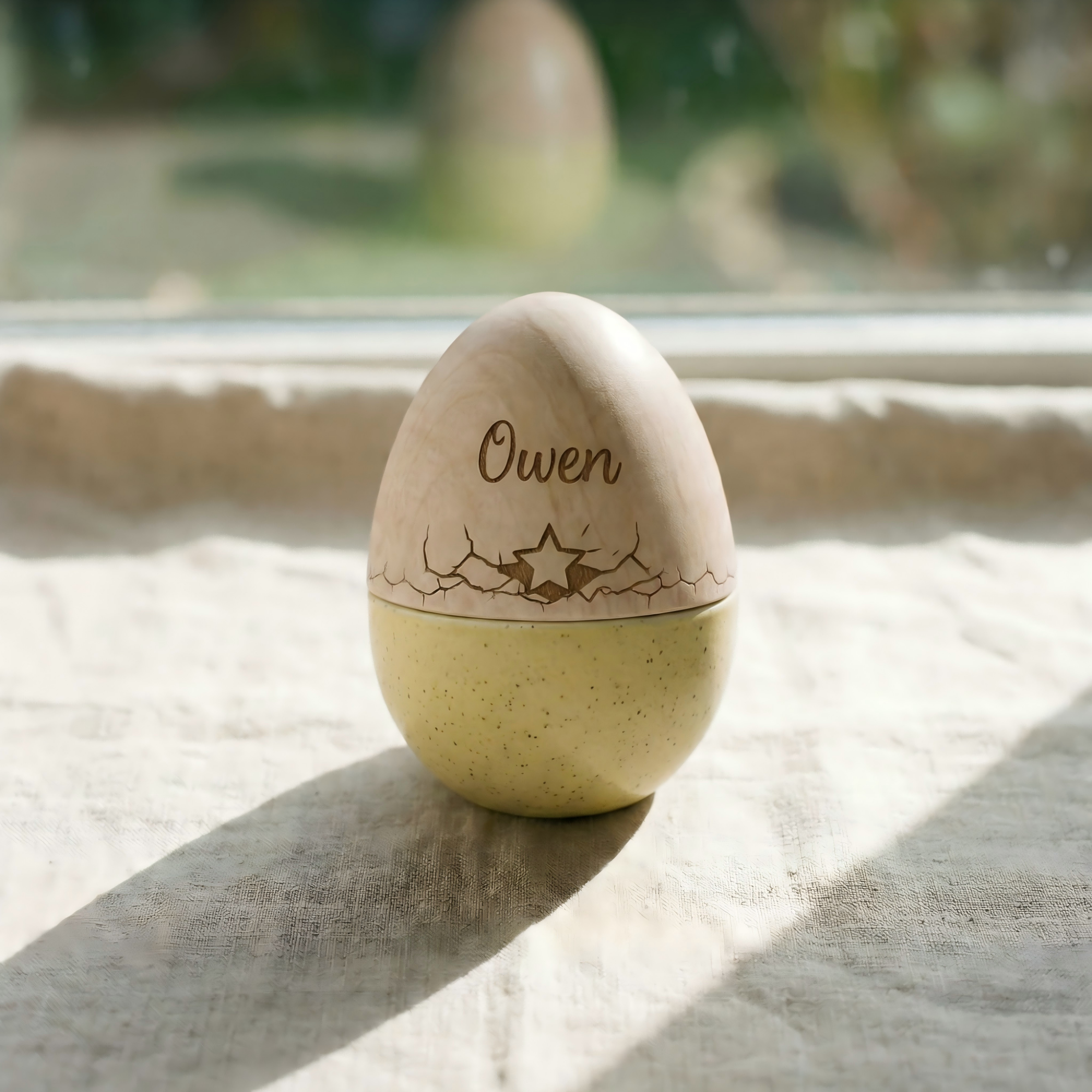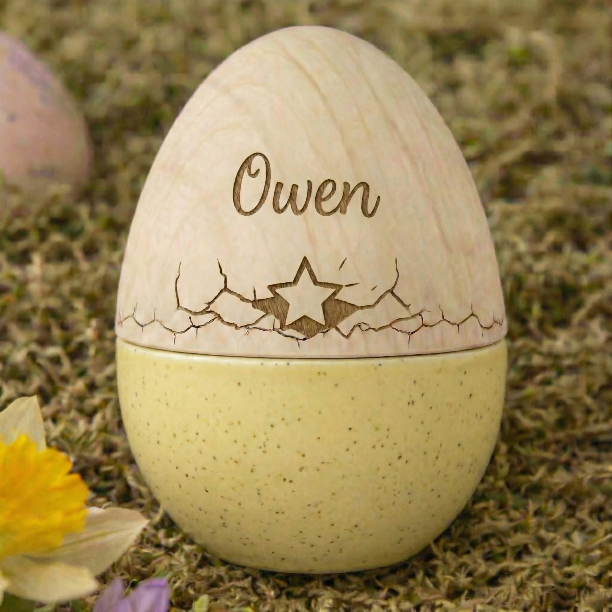 Bring a touch of personalized magic to your child's Easter with this Personalized Engraved Wooden Easter Egg. Featuring their name beautifully engraved and an adorable cut-out design—choose from a bunny, flower, tree, or star—this wooden egg is more than just a decoration. It's a reusable, fillable keepsake that blends tradition with creativity, designed to be cherished year after year as part of your family’s Easter celebrations.