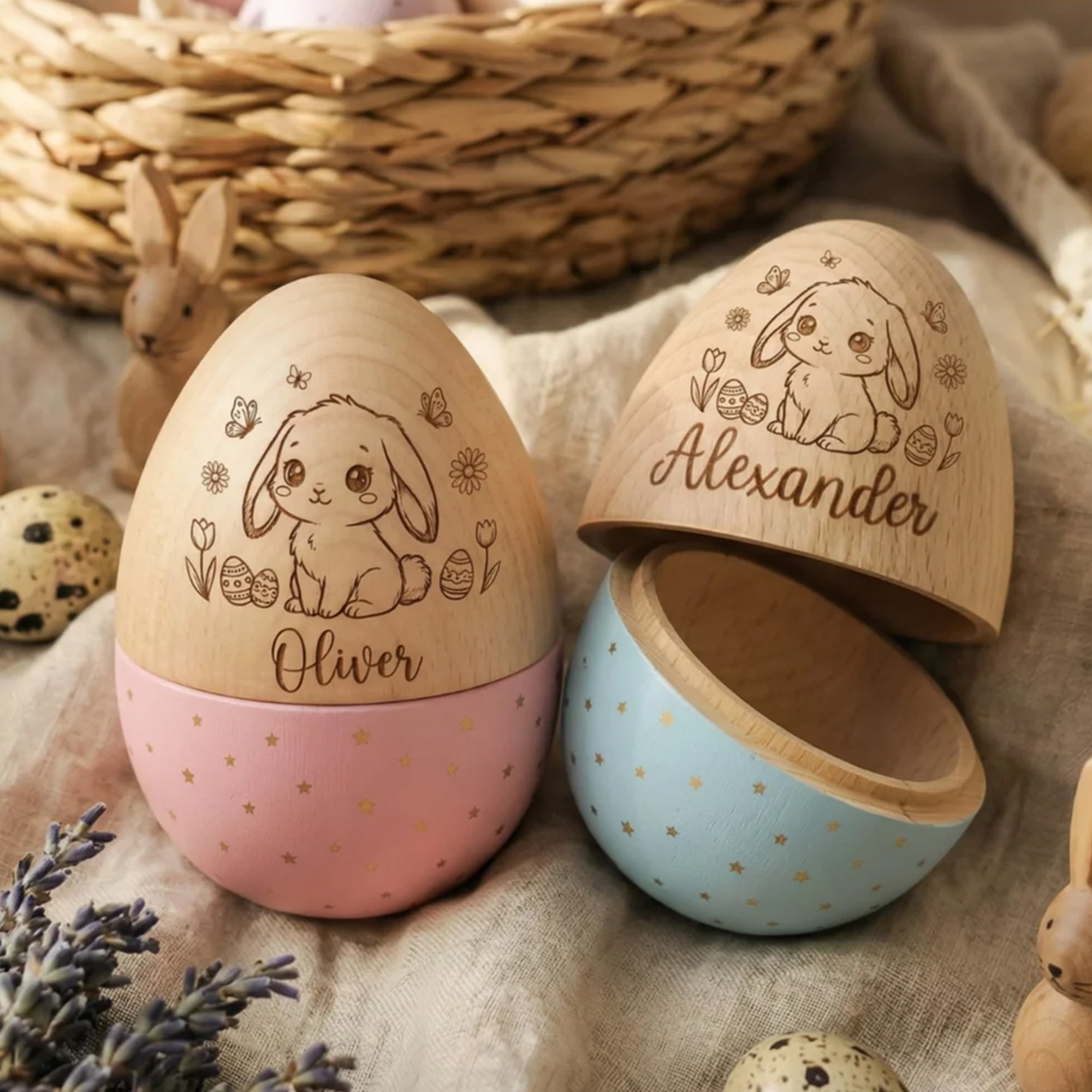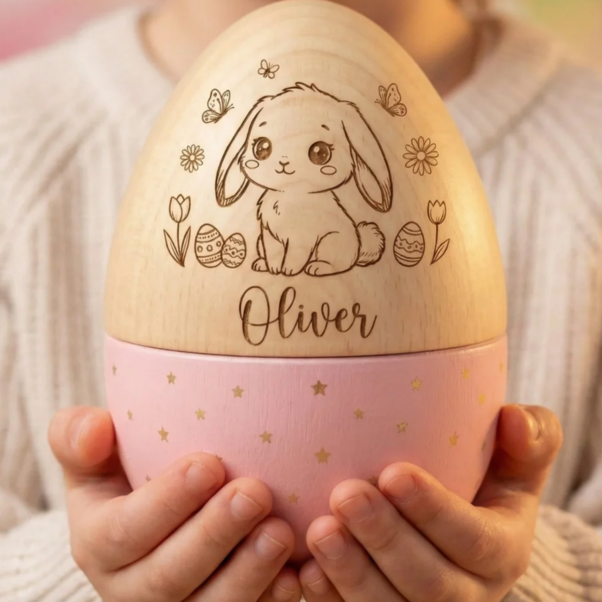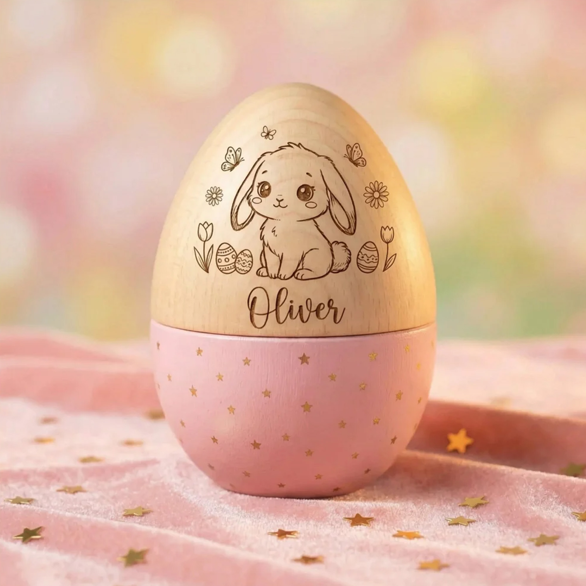 This hollow wooden Easter egg features an adorable engraved bunny illustration, surrounded by delicate flowers, butterflies, and tiny Easter eggs. The front is personalized with a custom name in elegant script, while the lower half is finished in soft pastel colors with gold star accents—blending playful Easter charm with a tailored, one-of-a-kind touch.